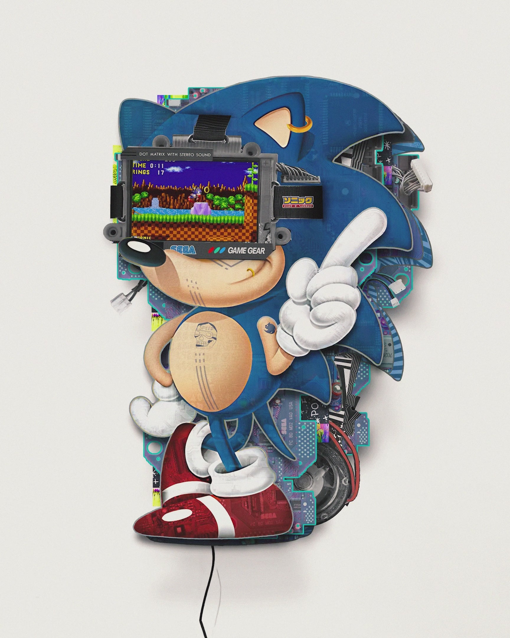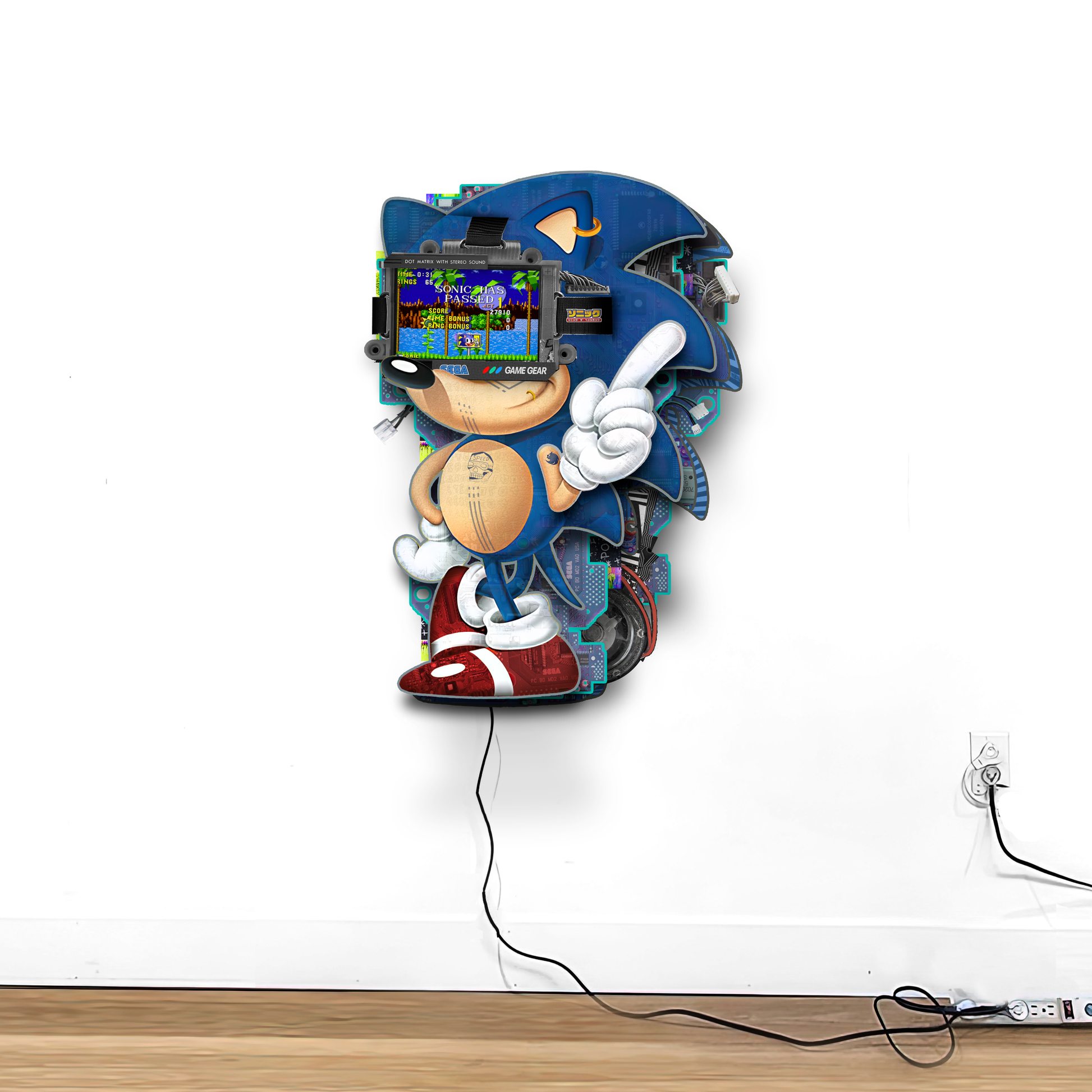 Laser cut acrylic, 7” IPS screen, Raspberry Pi, Sonic the Hedgehog ROM, wireless Genesis controller, 3D printed controller wall mount